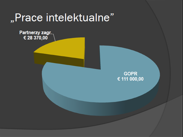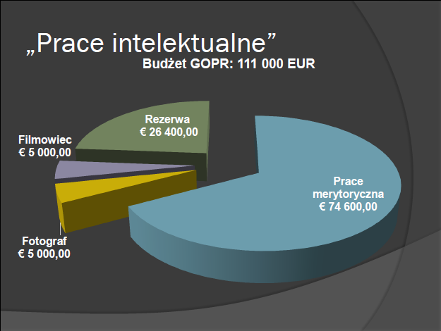 W zakresie finansów przewidzianych dla GOPR – 111 000 EUR – przewidziana jest również opłacenie pracy ratowników posiadających doświadczenie filmowe i fotograficzne (w ramach platformy planuje się korzystanie ze zdjęć i filmów) . W chwili obecnej przydzielono środki na prace merytoryczne (tworzenie szkoleń), fotografa i filmowca, a także zaplanowano rezerwę, ze względu na przewidywane korekty objętościowe materiałów w poszczególnych działów.