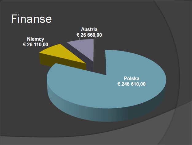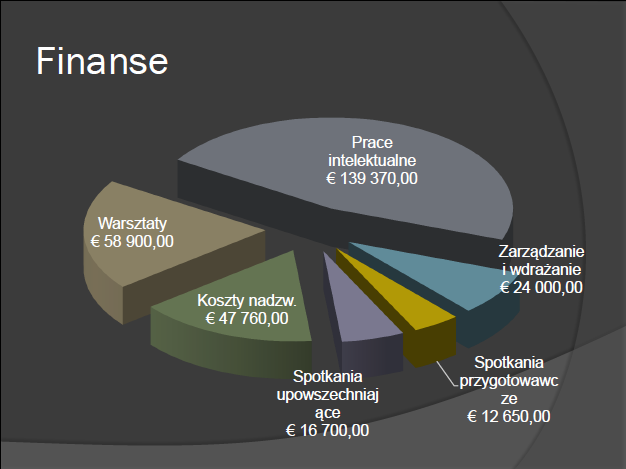 Na podstawie przygotowanych konspektów projektu, dotychczasowej objętości w szkoleniu podzielono środki w wysokości 74600 EUR na poszczególne działy zgodnie z poniższą tabelą.